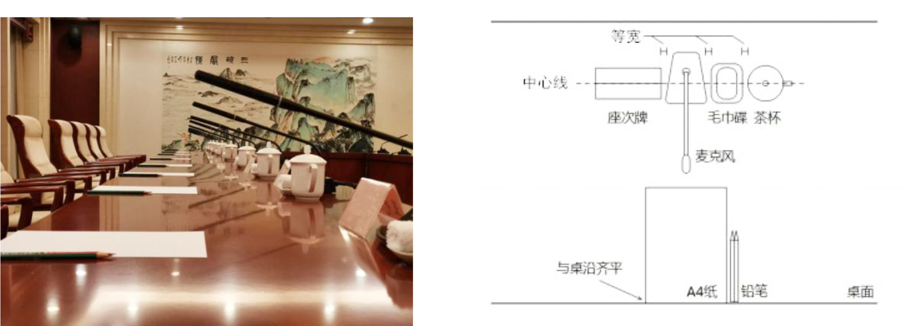 座牌、話筒、毛巾碟、茶杯從左至右依次擺放,中心線橫向呈一條直線并距桌外沿20cm(適用于寬70cm~75cm會(huì)議桌),間距1cm;話筒擺放位置、弧度整齊劃一,麥頭與桌面高度25cm;茶杯擺成一條直線,杯把統(tǒng)一向右(可擺放杯墊),杯把與垂直方向呈90度角(或45度角);會(huì)議資料和A4便簽紙整齊擺放在桌子居中位置,緊貼桌子下沿,鉛筆置于A4便簽紙右側(cè),見圖B.1。