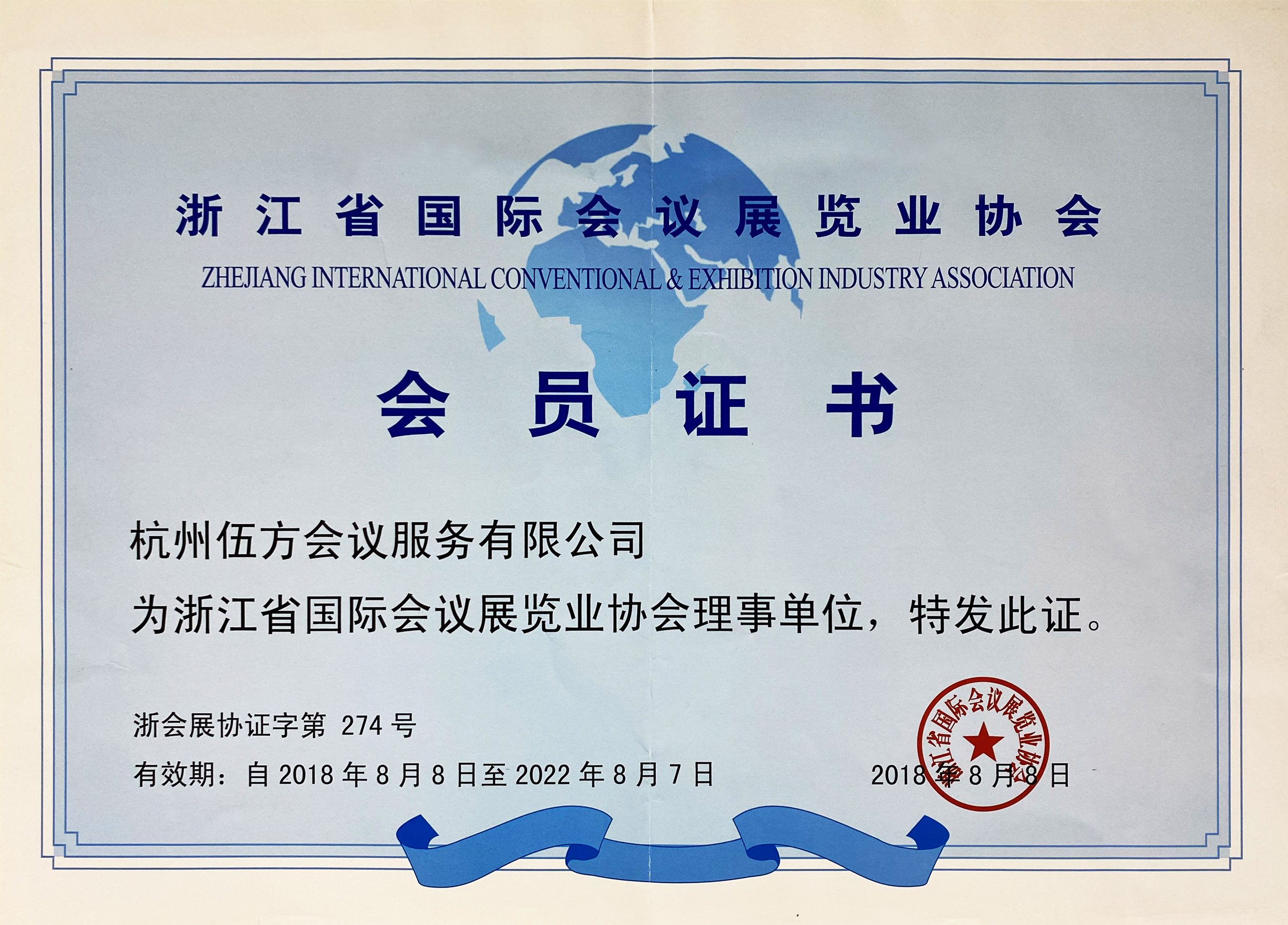 杭州伍方會議服務有限公司為浙江省國際會議展覽業(yè)協(xié)會理事單位,有效期自2018年8月8日至2022年8月7日。