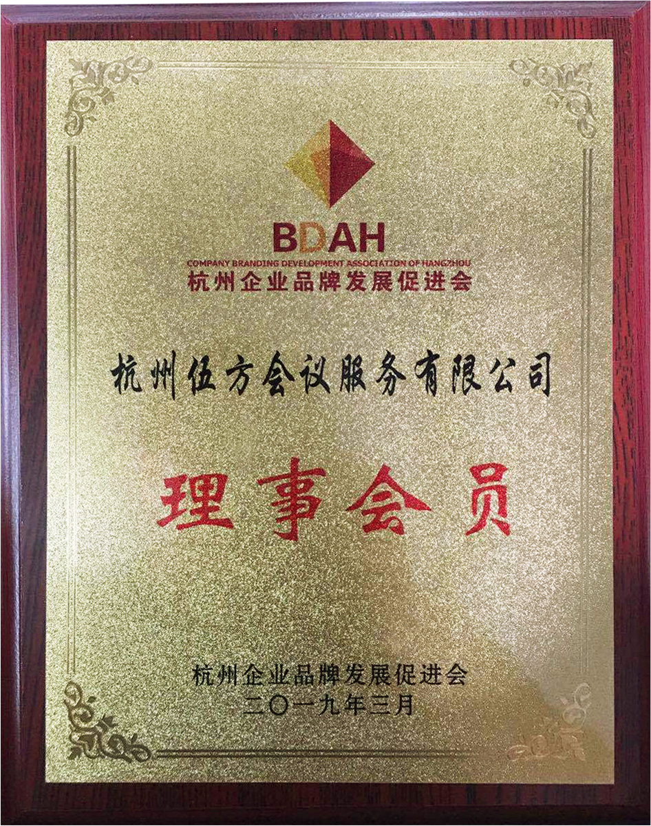 2019年3月,杭州伍方會議服務有限公司被評為杭州企業(yè)品牌發(fā)展促進會理事會員,并頒發(fā)證書。