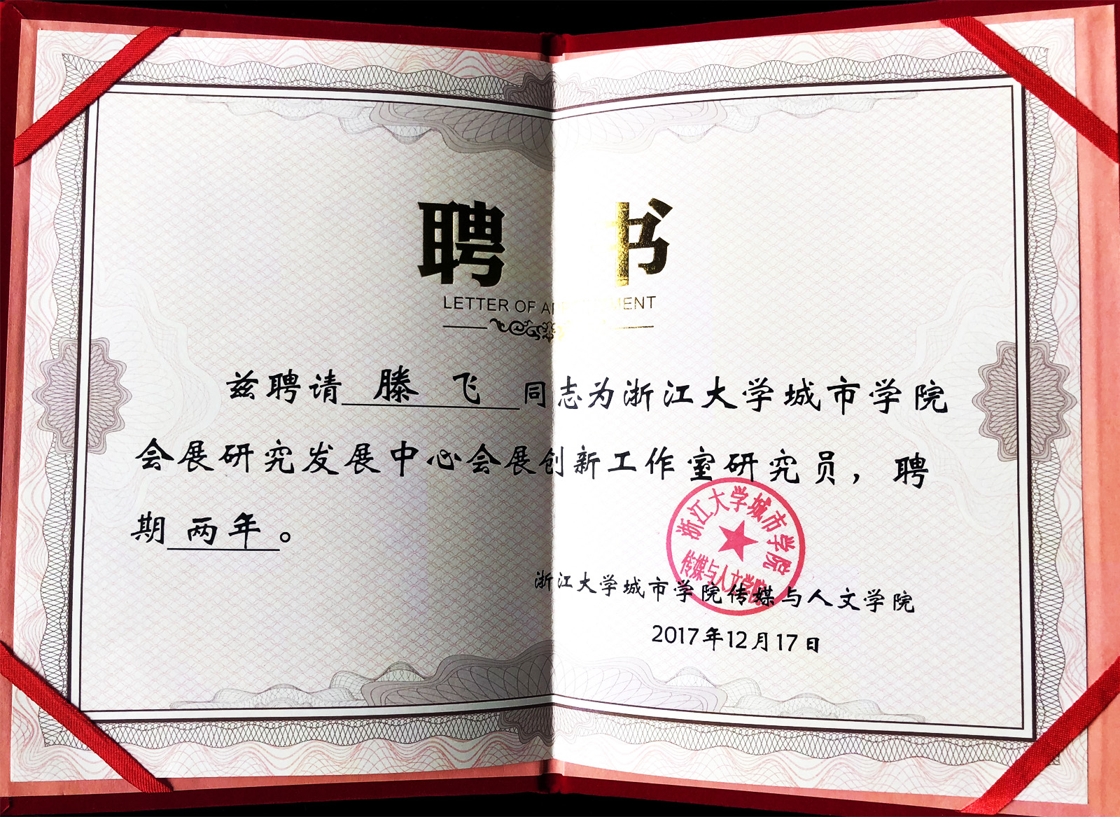 2017年12月17日,浙江大學城市學院傳媒與人文學院聘請滕慶磊(花名滕飛)為浙江大學城市學院會展研究發展中心會展創新工作室研究員。